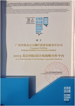 2013年10月24日下午,大黃鴨北京告別會暨“為愛而設(shè)計(jì)”公益活動頒獎典禮在頤和園舉行。設(shè)計(jì)周組委會向今年北京國際設(shè)計(jì)周期間表現(xiàn)卓越的機(jī)構(gòu)與設(shè)計(jì)師頒發(fā)獎項(xiàng),廣安控股大柵欄投資有限責(zé)任公司榮獲北京國際設(shè)計(jì)周戰(zhàn)略合作平臺獎,大柵欄更新計(jì)劃獲得2013北京國際設(shè)計(jì)周最受媒體歡迎獎,大柵欄領(lǐng)航員計(jì)劃中微胡同、老張的年畫、一勺子糖、胡同廁所等諸多項(xiàng)目分別獲獎。