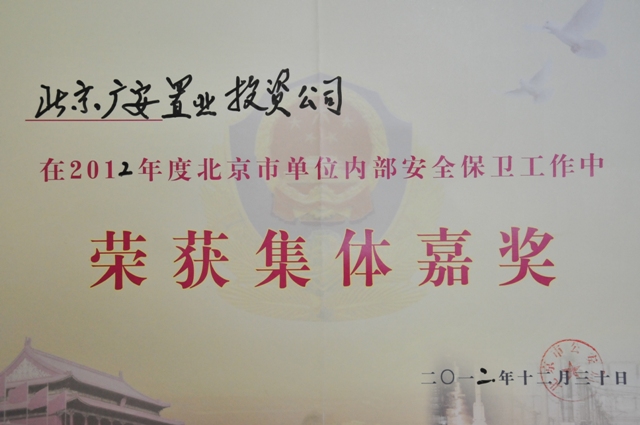 2013年1月10日,經(jīng)首都綜合治理辦公室和北京市公安局批準,北京廣安置業(yè)投資公司被授予“2012年度北京市單位內(nèi)部安全保衛(wèi)集體嘉獎”榮譽稱號。此稱號是北京市公安局對廣安置業(yè)在2012年度認真落實治安保衛(wèi)工作制度,并在治安保衛(wèi)工作中取得顯著成績的肯定和表揚。